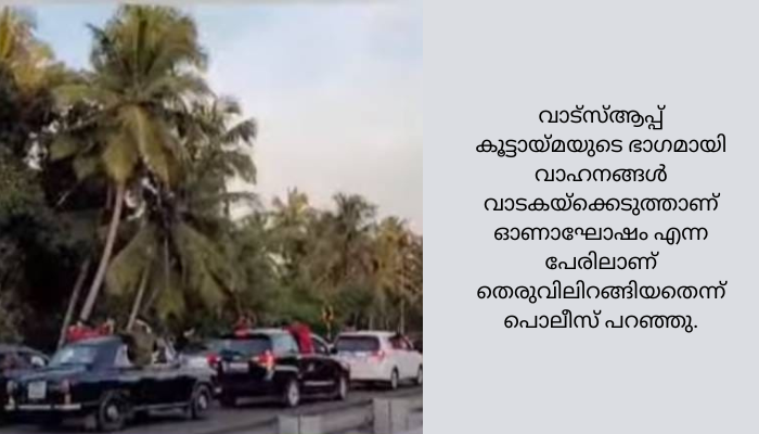 വിവിധ കോളേജുകളിലെ വിദ്യാർഥികളാണ് അഭ്യാസ പ്രകടനം നടത്തിയത്. മാങ്ങാട്-കവിയൂർ ഭാഗത്താണ് കാറിലും ബൈക്കിലുമായെത്തി അഭ്യാസപ്രകടനം നടത്തിയത്. പ്രദേശത്തെ സ്കൂൾ വിദ്യാർഥകളും വാഹനത്തിലുണ്ടായിരുന്നു. വാട്സ്ആപ്പ് കൂട്ടായ്മയുടെ ഭാഗമായി വാഹനങ്ങൾ വാടകയ്ക്കെടുത്താണ് ഓണാഘോഷം എന്ന പേരിലാണ് തെരുവിലിറങ്ങിയതെന്ന് പൊലീസ് പറഞ്ഞു.