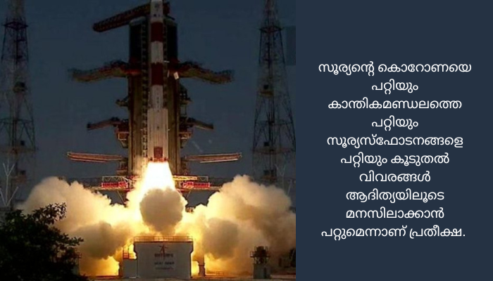 സൂര്യന്റെ കൊറോണയെ പറ്റിയും കാന്തികമണ്ഡലത്തെ പറ്റിയും സൂര്യസ്ഫോടനങ്ങളെ പറ്റിയും കൂടുതല് വിവരങ്ങള് ആദിത്യയിലൂടെ മനസിലാക്കാന് പറ്റുമെന്നാണ് പ്രതീക്ഷ. ചന്ദ്രനെ തൊട്ട് പത്ത് നാള് തികയും മുമ്പ് മറ്റൊരു സുപ്രധാന ദൗത്യത്തിന് തയ്യാറെടുക്കുകയാണ് ഐ എസ് ആര് ഒ.