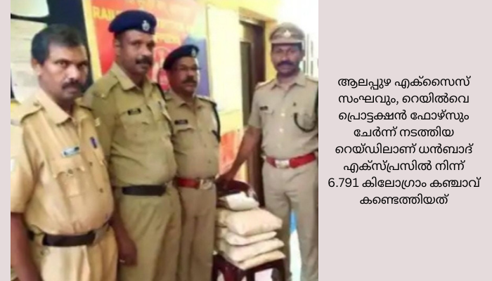 ആലപ്പുഴ: ധന്ബാദ് എക്സ്പ്രസില് നിന്ന് ആറര കിലോ കഞ്ചാവ് പിടിച്ചെടുത്തു. ഓണം സ്പെഷ്യല് ഡ്രൈവിനോടനുബന്ധിച്ച് ആലപ്പുഴ എക്സൈസ് സംഘവും, റെയില്വെ പ്രൊട്ടക്ഷന് ഫോഴ്സും ചേര്ന്ന് നടത്തിയ റെയ്ഡിലാണ് ധന്ബാദ് എക്സ്പ്രസില് നിന്ന് 6.791 കിലോഗ്രാം കഞ്ചാവ് കണ്ടെത്തിയത്. റെയ്ഡില് ആലപ്പുഴ എക്സൈസ് സര്ക്കിള് ഇന്സ്പെക്ടര് വൈ. പ്രസാദ്, പ്രിവെന്റിവ് ഓഫീസര് എസ്. മധു, എം.സി ബിനു, വികാസ്, ആന്റണി, ജോസ്, അലക്സാണ്ടര്, റെയില്വെ പ്രൊട്ടക്ഷന് ഫോഴ്സ് സബ് ഇന്സ്പെക്ടര് പി. ആര് സുരേന്ദ്രന്, അസി. സബ് ഇന്സ്പെക്ടര് എ. അജി മോന്, ശ്രീനിവാസന്, സുരേഷ് കുമാര് എന്നിവര് പങ്കെടുത്തു.