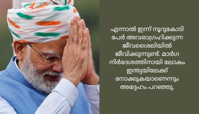 ഇന്ത്യയെക്കുറിച്ചുള്ള ലോകത്തിന്റെ കാഴ്ചപ്പാട് മാറുകയാണ്. നൂറുകോടി ദരിദ്രരായിരുന്നു രാജ്യത്ത് വളരെ കാലമായി വിശന്നിരുന്നത്. എന്നാൽ ഇന്ന് നൂറുകോടി പേർ അവരാഗ്രഹിക്കുന്ന ജീവശൈലിയിൽ ജീവിക്കുന്നുണ്ട്. മാർഗ നിർദേശത്തിനായി ലോകം ഇന്ത്യയിലേക്ക് നോക്കുകയാണെന്നും അദ്ദേഹം പറഞ്ഞു.