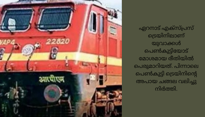 നാഗർകോവിലിൽ നിന്ന് മംഗലാപുരത്തേക്ക് പോവുകയായിരുന്ന ഏറനാട് എക്സ്പ്രസ് ട്രെയിനിലാണ് യുവാക്കൾ പെൺകുട്ടിയോട് മോശമായ രീതിയിൽ പെരുമാറിയത്. പിന്നാലെ പെൺകുട്ടി ട്രെയിനിന്റെ അപായ ചങ്ങല വലിച്ചു നിർത്തി.