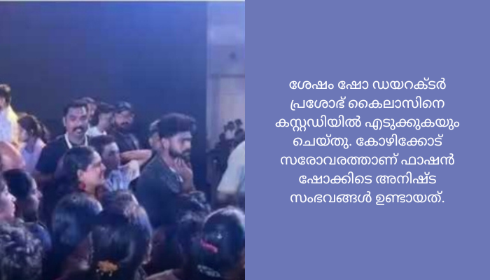 നിലവാരമില്ലാത്ത കോസ്ട്യൂം നൽകിയെന്ന് ആരോപിച്ച് ഷോയിൽ പങ്കെടുക്കാൻ എത്തിയവർ പ്രതിഷേധം തുടങ്ങുകയായിരുന്നു. പ്രതിഷേധം കനത്തതോടെ പൊലീസും സ്ഥലത്തെത്തി. പ്രതിഷേധക്കാർക്ക് പറയാനുള്ളതെല്ലാം കേട്ട ശേഷം പൊലീസ് ഇടപെട്ട് ഫാഷൻ ഷോ നിർത്തിവയ്പ്പിച്ചു. ശേഷം ഷോ ഡയറക്ടർ പ്രശോഭ് കൈലാസിനെ കസ്റ്റഡിയിൽ എടുക്കുകയും ചെയ്തു. കോഴിക്കോട് സരോവരത്താണ് ഫാഷൻ ഷോക്കിടെ അനിഷ്ട സംഭവങ്ങൾ ഉണ്ടായത്.