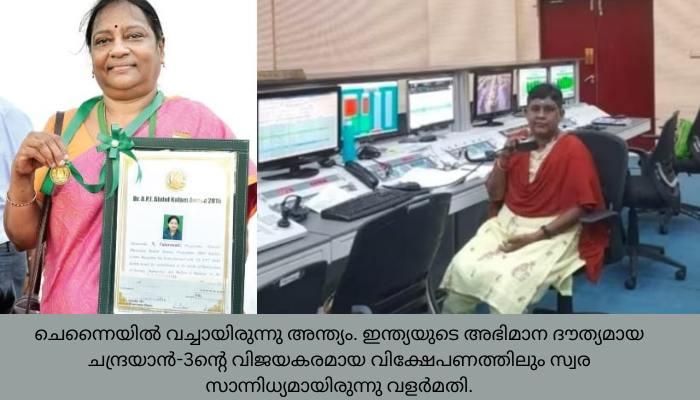 .ചെന്നൈ : ഐഎസ്ആർഒയുടെ ബഹിരാകാശ ദൗത്യങ്ങൾക്കായുള്ള വിക്ഷേപണ കൗണ്ട്ഡൗണിന് പിന്നിലെ ഐകോണിക് ശബ്ദസാന്നിധ്യമായ ശാസ്ത്രജ്ഞ എൻ വളർമതി(64) അന്തരിച്ചു. ഹൃദയാഘാതത്തെ തുടർന്ന് . 2023 സെപ്ശതംബർ 2 ശനിയാഴ്ച ചെന്നൈയിൽ വച്ചായിരുന്നു അന്ത്യം. ഇന്ത്യയുടെ അഭിമാന ദൗത്യമായ ചന്ദ്രയാൻ-3ന്റെ വിജയകരമായ വിക്ഷേപണത്തിലും സ്വര സാന്നിധ്യമായിരുന്നു വളർമതി.