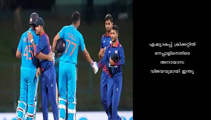 പല്ലക്കെലെ (കാന്‍ഡി): ഏഷ്യാകപ്പ് ക്രിക്കറ്റില്‍ നേപ്പാളിനെതിരേ അനായാസവിജയവുമായി ഇന്ത്യ. ഇന്ത്യയ്ക്ക് 10 വിക്കറ്റിന്റെ തകര്‍പ്പന്‍ ജയം. വിജയത്തോടെ ഇന്ത്യ സൂപ്പര്‍ ഫോറില്‍ കടന്നു. മഴ കളിച്ച മത്സരത്തില്‍ ഓപ്പണര്‍മാരായ രോഹിത് ശര്‍മ്മയുടേയും ശുഭ്മാന്‍ ഗില്ലിന്റേയും അര്‍ധ സെഞ്ച്വറികളാണ് ഇന്ത്യയ്ക്ക് ആധികാരിക വിജയമൊരുക്കിയത്. നായകന്‍ രോഹിത് ശര്‍മ്മ 74 റണ്‍സും ഗില്‍ 67 റണ്‍സുമെടുത്ത് പുറത്താകാതെ നിന്നു. ആദ്യം ബാറ്റു ചെയ്ത നേപ്പാള്‍ 230 റണ്‍സിന് എല്ലാവരും പുറത്തായിരുന്നു.തുടര്‍ന്ന് 231 റണ്‍സ് വിജയലക്ഷ്യം തേടി ഇന്ത്യ ബാറ്റ് ചെയ്യുന്നതിനിടെ രസംകൊല്ലിയായി മഴ കളിമുടക്കി. ഇതേത്തുടര്‍ന്ന് ഇന്ത്യയുടെ വിജയലക്ഷ്യം 23 ഓവറില്‍ 145 റണ്‍സായി പുനര്‍ നിശ്ചയിച്ചു. രോഹിതിന്റെയും ഗില്ലിന്റെയും കരുത്തില്‍ ഇന്ത്യ 20.1 ഓവറില്‍ വിക്കറ്റ് നഷ്ടമില്ലാതെ ഇന്ത്യ ലക്ഷ്യം കണ്ടു. രോഹിത് ശര്‍മ്മയാണ് മാന്‍ ഓഫ് ദ മാച്ച്. ആദ്യം ബാറ്റു ചെയ്ത നേപ്പാള്‍ 48.2 ഓവറില്‍ 230 റണ്‍സിന് ഓള്‍ഔട്ടായി.ആസിഫ് ഷെയ്ഖ് (58), സോംപാല്‍ കാമി (48), കുശാല്‍ ഭര്‍ട്ടല്‍ (25 പന്തില്‍ 38) എന്നിവരുടെ മികച്ച പ്രകടനമാണ് നേപ്പാളിനെ ഭേദപ്പെട്ട സ്‌കോറിലേക്ക് എത്തിച്ചത്. സൂപ്പര്‍ഫോറില്‍. മഴയെത്തുടര്‍ന്ന് ഓവറുകള്‍ വെട്ടിച്ചുരുക്കിയ മത്സരത്തില്‍ ഇന്ത്യയുടെ വിജയലക്ഷ്യം 23 ഓവറില്‍ 145 റണ്‍സായി പുനര്‍നിശ്ചയിക്കുകയായിരുന്നു. ഈ ലക്ഷ്യം ഇന്ത്യ അനായാസം മറികടന്നു.