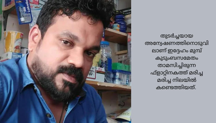 തുടർച്ചയായ അന്വേഷണത്തിനൊടുവിലാണ് ഇദ്ദേഹം മുമ്പ് കുടുംബസമേതം താമസിച്ചിരുന്ന ഫ്ളാറ്റിനകത്ത് മരിച്ച മരിച്ച നിലയിൽ കണ്ടെത്തിയത്. സാമ്പത്തിക ബാധ്യത കാരണം ആത്മഹത്യ ചെയ്തതെന്നാണ് കരുതുന്നത്. ഭാര്യ അമൃതയും മകനും ഇപ്പോൾ നാട്ടിലാണ്. ബഹ്റൈൻ കേരള സോഷ്യൽ ഫോറം ഹെൽപ് ലൈനും സ്പോൺസറും ഇന്ത്യൻ എംബസിയുമായി ബന്ധപ്പെട്ട് മൃതദേഹം നാട്ടിലേക്ക് കൊണ്ട് പോകാനുള്ള നിയമ നടപടികൾ പൂർത്തിയാക്കി വരുന്നു. .