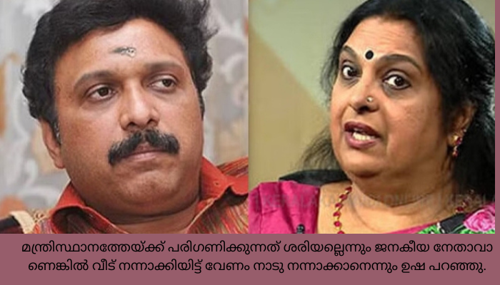 തിരുവനന്തപുരം: കേരള കോൺഗ്രസ് ബി ചെയർമാനും പത്തനാപുരം എംഎൽഎയുമായ കെ.ബി. ഗണേഷ് കുമാറിനെ മന്ത്രിസ്ഥാനത്തേക്കു പരിഗണിക്കുന്നത് ഉചിതമല്ലെന്ന് സഹോദരി ഉഷ മോഹന്ദാസ്. കുടുംബ സ്വത്ത് തട്ടിയെടുത്തെന്ന കേസ് കോടതിയുടെ പരിഗണനയിലിരിക്കുമ്പോള് മന്ത്രിസ്ഥാനത്തേയ്ക്ക് പരിഗണിക്കുന്നത് ശരിയല്ലെന്നും ജനകീയ നേതാവാണെങ്കില് വീട് നന്നാക്കിയിട്ട് വേണം നാടു നന്നാക്കാനെന്നും ഉഷ പറഞ്ഞു.