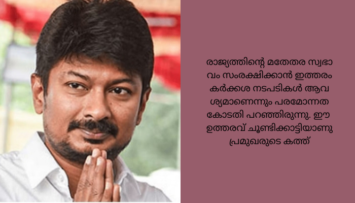 സനാതനധർമത്തെ ഉന്മൂലനം ചെയ്യണമെന്ന് ആഹ്വാനം ചെയ്യുക മാത്രമല്ല, അത് നിരന്തരം ആവർത്തിച്ചുകൊണ്ടിരിക്കുകയുമാണ് ഡിഎംകെ യുവ നേതാവ് കൂടിയായ ഉദയനിധി. ഇതു സനാതനധർമം പിന്തുടരുന്ന ഞങ്ങളെപ്പോലുള്ള കോടിക്കണക്കിനാളുകൾക്ക് ആശങ്കയും വേദനയുമുണ്ടാക്കുന്നു. തമിഴ്നാട് സർക്കാർ ഉദയനിധിക്കെതിരേ നടപടിയെടുക്കുന്നില്ലെന്നതിനു പുറമേ മന്ത്രിയെ പിന്തുണയ്ക്കുകയും കൂടി ചെയ്തെന്നും കത്തിൽ ചൂണ്ടിക്കാട്ടി.