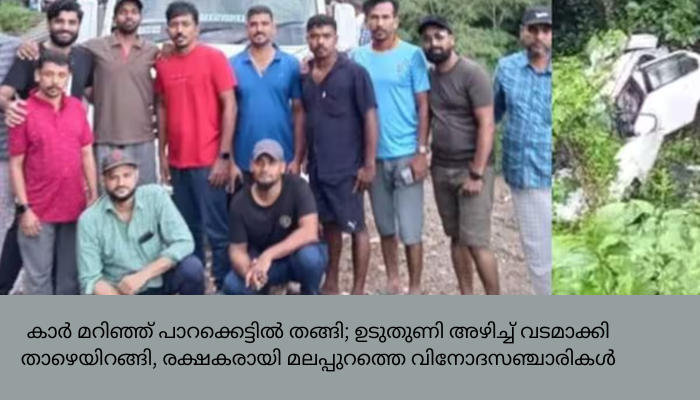 കാര്‍ മറിഞ്ഞ് പാറക്കെട്ടിൽ തങ്ങി; ഉടുതുണി അഴിച്ച്‌ വടമാക്കി താഴെയിറങ്ങി, രക്ഷകരായി മലപ്പുറത്തെ വിനോദസഞ്ചാരികൾ