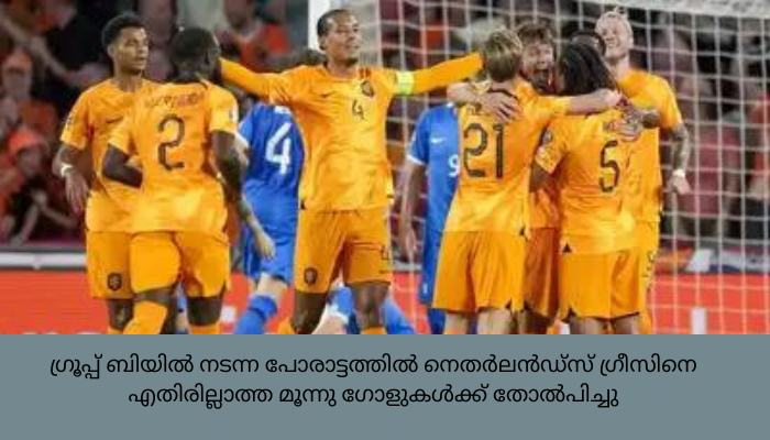 ഗ്രൂപ്പ് ബിയില് നടന്ന പോരാട്ടത്തില് നെതര്ലന്ഡ്സ് ഗ്രീസിനെ എതിരില്ലാത്ത മൂന്നു ഗോളുകള്ക്ക് തോല്പിച്ചു. മാര്ട്ടന് ഡിറൂണ്, കോഡി ഗാക്പോ, വൂട്ട് വെഗോസ്റ്റ് എന്നിവരാണ് സ്കോര് ചെയ്തത്. മൂന്നു ഗോളിനും വഴിയൊരുക്കി ഇന്റര്മിലാന് പ്ലേമേക്കര് ഡംഫ്രെസ് മിന്നി.