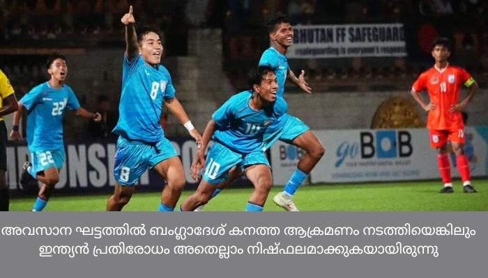 തിംഫു: കിംഗ്സ് കപ്പില് സീനിയര് ടീം നിരാശപ്പെടുത്തിയപ്പോള് കിരീട നേട്ടവുമായി അണ്ടര് 16 ടീം. അണ്ടര് 16 സാഫ് കിരീടമാണ് ഇന്ത്യന് ടീം നേടിയത്. ഫൈനലില് ബംഗ്ലാദേശിനെ എതിരില്ലാത്ത രണ്ട് ഗോളുകള്ക്കാണ് ഇന്ത്യ പരാജയപ്പെടുത്തിയത്.കളിയുടെ എട്ടാം മിനുട്ടില് തന്നെ ആദ്യ ഗോള് നേടി മേധാവിത്വം പുലര്ത്താന് ഇന്ത്യന് ടീമിന് സാധിച്ചു. ഭരത് ലെയ്റിന്ജാം ആണ് ബംഗ്ലാദേശിന്റെ വല കുലുക്കിയത്. 73ാം മിനുട്ടിലാണ് ഇന്ത്യയുടെ രണ്ടാം ഗോള് പിറന്നത്. ലെവിസ് സാംഗ്മിന്ലുന് ആണ് ഗോള് നേടിയത്.അവസാന ഘട്ടത്തില് ബംഗ്ലാദേശ് കനത്ത ആക്രമണം നടത്തിയെങ്കിലും ഇന്ത്യന് പ്രതിരോധം അതെല്ലാം നിഷ്ഫലമാക്കുകയായിരുന്നു. ഈ വര്ഷത്തെ സീനിയര് സാഫ് കിരീടവും ഇന്ത്യക്കായിരുന്നു.
