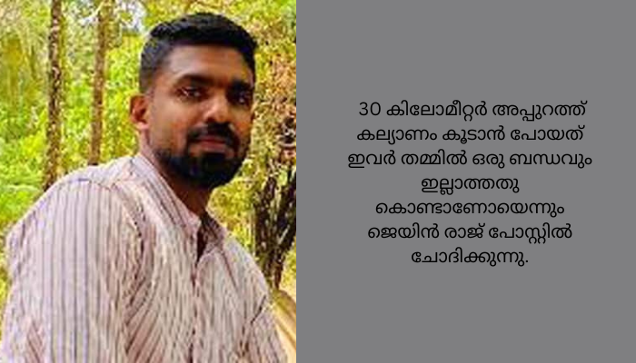 അർജുൻ ആയങ്കിയുടെ കല്യാണത്തിൽ കിരൺ പങ്കെടുത്തതിന്റെ തെളിവെന്ന തരത്തിൽ ഫോട്ടോയും ജെയിൻരാജ് സമൂഹമാധ്യമത്തിൽ പങ്കുവച്ചിട്ടുണ്ട്. 30 കിലോമീറ്റർ അപ്പുറത്ത് കല്യാണം കൂടാൻ പോയത് ഇവർ തമ്മിൽ ഒരു ബന്ധവും ഇല്ലാത്തതു കൊണ്ടാണോയെന്നും ജെയിൻ രാജ് പോസ്റ്റിൽ ചോദിക്കുന്നു.
