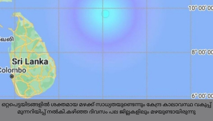 അതേസമയം, അടുത്ത 3 മണിക്കൂറിൽ കേരളത്തിലെ തിരുവനന്തപുരം, കൊല്ലം, ആലപ്പുഴ, എറണാകുളം ജില്ലകളിൽ ഒറ്റപ്പെട്ടയിടങ്ങളിൽ മിതമായ മഴയ്ക്കും പത്തനംതിട്ട, കോട്ടയം, ഇടുക്കി, തൃശൂർ ജില്ലകളിൽ ഒറ്റപ്പെട്ടയിടങ്ങളിൽ നേരിയ മഴയ്ക്കും സാധ്യതയുണ്ടെന്ന് കേന്ദ്ര കാലാവസ്ഥ വകുപ്പ് അറിയിച്ചു.
