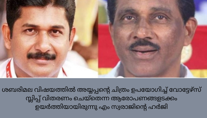 ശബരിമല വിഷയത്തിൽ അയ്യപ്പന്റെ ചിത്രം ഉപയോഗിച്ച് വോട്ടേഴ്സ് സ്ലിപ്പ് വിതരണം ചെയ്തെന്ന ആരോപണങ്ങളടക്കം ഉയർത്തിയായിരുന്നു എം സ്വരാജിന്റെ ഹർജി.
