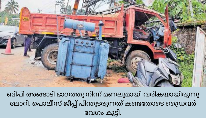 തിരൂർ ∙ പൊലീസ് വണ്ടി കണ്ട് വേഗം കൂട്ടിയ മണൽ ലോറി നിയന്ത്രണം വിട്ട് ട്രാൻസ്ഫോമറിലിടിച്ച് അപകടം. പരുക്കേറ്റ ലോറി ഡ്രൈവർ കടന്നുകളഞ്ഞു. ഇന്നലെ പുലർച്ചെ താഴേപ്പാലം പള്ളിയുടെ മുൻപിലുള്ള ട്രാൻസ്ഫോമറിലാണു ലോറിയിടിച്ചത്. ബിപി അങ്ങാടി ഭാഗത്തു നിന്ന് മണലുമായി വരികയായിരുന്നു ലോറി. പൊലീസ് ജീപ്പ് പിന്തുടരുന്നത് കണ്ടതോടെ ഡ്രൈവർ വേഗം കൂട്ടി.