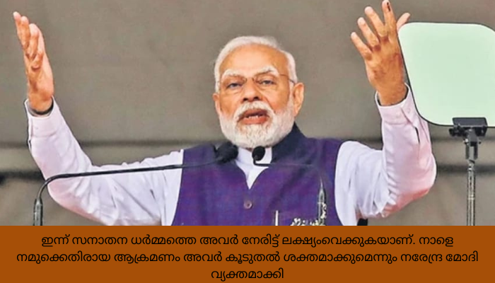 സ്വാമി വിവേകാനന്ദനും ലോകമാന്യ ബാലഗംഗാധര തിലകനും പ്രചോദനം നൽകിയത് സനാതന ധർമ്മമാണ്. ഇന്ന് സനാതന ധർമ്മത്തെ അവർ നേരിട്ട് ലക്ഷ്യംവെക്കുകയാണ്. നാളെ നമുക്കെതിരായ ആക്രമണം അവർ കൂടുതൽ ശക്തമാക്കുമെന്നും നരേന്ദ്ര മോദി വ്യക്തമാക്കി. സനാതന ധർമ്മത്തെ പിന്തുണക്കുന്ന എല്ലാവരും ജാഗ്രതയോടെ ഇതിനെ നേരിടണമെന്നും അദ്ദേഹം കൂട്ടിച്ചേർത്തു.രാജ്യത്തിന്റേയും സംസ്ഥാനങ്ങളുടേയും വികസനത്തിന് സർക്കാറുകൾ സുതാര്യതയോടും അഴിമതിരഹിതമായും പ്രവർത്തിക്കേണ്ടത് അത്യാവശ്യമാണ്.