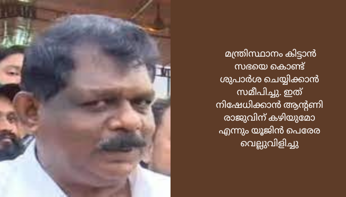 രണ്ടര വർഷത്തിന് പകരം അഞ്ച് വർഷവും മന്ത്രിസ്ഥാനം കിട്ടാൻ സഭയെ കൊണ്ട് ശുപാർശ ചെയ്യിക്കാൻ സമീപിച്ചു. ഇത് നിഷേധിക്കാൻ ആന്റണി രാജുവിന് കഴിയുമോ എന്നും യൂജിൻ പെരേര വെല്ലുവിളിച്ചു. താൻ ലത്തീൻ സഭയുടെ മാത്രം മന്ത്രിയല്ല എന്ന ആന്റണി രാജുവിന്റെ പ്രതികരണത്തോടായിരുന്നു ഫാദർ യൂജിൻ പെരേരയുടെ പ്രതികരണം. ‘നില്ക്കുന്ന നിലയ്ക്ക് കണ്ടം ചാടുന്ന ആളാണ് ആന്റണി രാജു. 5 വർഷത്തേക്കുമുള്ള മന്ത്രി സ്ഥാനത്തിന് ഓശാരം പറയിക്കാൻ എന്നെ നേരിട്ട് വന്ന് കണ്ടയാളാണ് അദ്ദേഹം. ഒന്നല്ല പലതവണ കണ്ടിട്ടുണ്ട്’. യൂജിൻ പെരേര വെളിപ്പെടുത്തി.