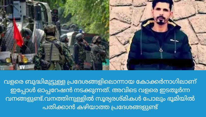 വളരെ ബുദ്ധിമുട്ടുള്ള പ്രദേശങ്ങളിലൊന്നായ കോക്കർനാഗിലാണ് ഇപ്പോൾ ഓപ്പറേഷൻ നടക്കുന്നത്. അവിടെ വളരെ ഇടതൂർന്ന വനങ്ങളുണ്ട്.വനത്തിനുള്ളിൽ സൂര്യരശ്മികൾ പോലും ഭൂമിയിൽ പതിക്കാൻ കഴിയാത്ത പ്രദേശങ്ങളുണ്ട്. കുത്തനെയുള്ളതും തകർന്നതുമായ പാറക്കെട്ടുകളുണ്ട്. ഭീകരർ അവിടെയുണ്ടെന്ന് സ്ഥിരീകരിച്ചിട്ടുണ്ട്. ഈ വിവരത്തിന്റെ പ്രാധാന്യം മനസ്സിലാക്കി കമാൻഡിംഗ് ഓഫീസർ തന്നെ ഓപ്പറേഷന് നേതൃത്വം നൽകിയെന്നും അദ്ദേഹം കൂട്ടിച്ചേർത്തു.