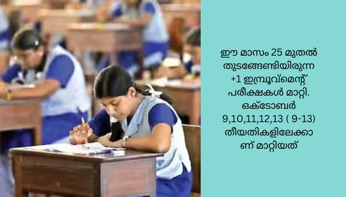 ഈ മാസം 25 മുതൽ തുടങ്ങേണ്ടിയിരുന്ന +1 ഇമ്പ്രൂവ്‌മെന്റ് പരീക്ഷകൾ മാറ്റി. ഒക്ടോബർ 9,10,11,12,13 ( 9-13) തീയതികളിലേക്കാണ് മാറ്റിയത്. കോഴിക്കോട്ട് നിപ വ്യാപനമുണ്ടായ സാഹചര്യത്തിൽ ജില്ലയിലെ മുഴുവൻ കുട്ടികൾക്കും ഓൺലൈൻ ക്ലാസ്സ്‌ സൗകര്യം ഒരുക്കിയതായും മന്ത്രി വിശദീകരിച്ചു