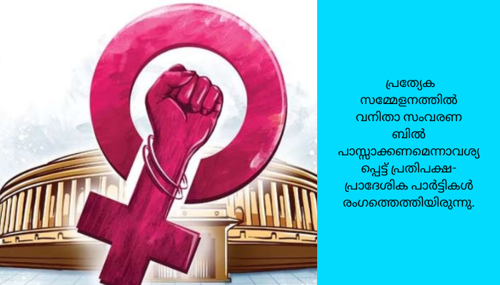 പ്രത്യേക സമ്മേളനത്തിനു മുന്നോടിയായി വിളിച്ചു കൂട്ടിയ സർവകക്ഷിയോഗത്തിലാണ് വനിതാ സംവരണ ബില്ലിനു വേണ്ടി പാർട്ടികൾ മുന്നോട്ടു വന്നത്. ഈ സമ്മേളനത്തിൽ ബിൽ പാസ്സാക്കണമെന്ന് എല്ലാ പ്രതിപക്ഷ പാർട്ടികളും ആവശ്യപ്പെട്ടതായി സർവകക്ഷിയോഗത്തിനു ശേഷം കോൺഗ്രസ് നേതാവ് അധിർ രഞ്ജൻ ചൗധരി വ്യക്തമാക്കിയിരുന്നു.