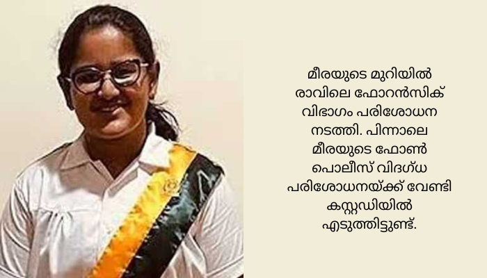 ചര്ച്ച് പാര്ക്ക് സേക്രഡ് ഹാര്ട്ട് സ്കൂളിലെ 12-ാം ക്ലാസ് വിദ്യാര്ഥിനി ആയിരുന്നു മീര. പഠനത്തില് മികവ് പുലര്ത്തുന്ന, പാഠ്യേതര പ്രവര്ത്തനങ്ങളിലും താല്പര്യമുള്ള ആള് ആയിരുന്നു. മീരയുടെ മുറിയില് രാവിലെ ഫോറന്സിക് വിഭാഗം പരിശോധന നടത്തി. പിന്നാലെ മീരയുടെ ഫോണ് പൊലീസ് വിദഗ്ധ പരിശോധനയ്ക്ക് വേണ്ടി കസ്റ്റഡിയില് എടുത്തിട്ടുണ്ട്.