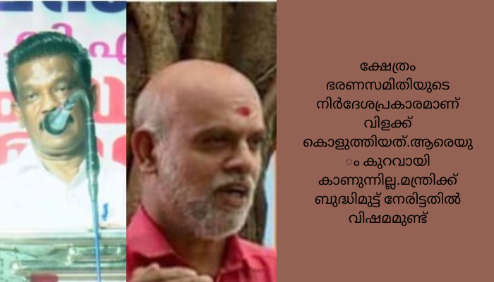 മന്ത്രിയല്ല മകനായാലും ആ സമയത്ത് അങ്ങനെയെ ചെയ്യൂ .ക്ഷേത്രം ഭരണസമിതിയുടെ നിർദേശപ്രകാരമാണ് വിളക്ക് കൊളുത്തിയത്.ആരെയും കുറവായി കാണുന്നില്ല.മന്ത്രിക്ക് ബുദ്ധിമുട്ട് നേരിട്ടതിൽ വിഷമമുണ്ട്.മന്ത്രി പറഞ്ഞത് പോലെ ജാതി വിവേചനം ഉണ്ടായിട്ടില്ല.പൂജ സമയമല്ലായിരുന്നെങ്കിൽ മന്ത്രിയുടെ കൂടെ ഇരിക്കും.വിവാദങ്ങൾ തന്നെയും കുടുംബത്തെയും വേദനിപ്പിച്ചു .മന്ത്രിയുടെ കൂടെ ഫോട്ടോ എടുക്ക്ണം എന്ന് വരെ ആഗ്രഹമുണ്ടായിരുന്നുവെന്നും അദ്ദേഹം പറഞ്ഞു.