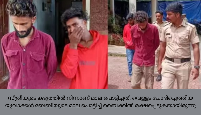 മടിക്കൈ: ബൈക്കിലെത്തി സ്ത്രീയുടെ മാല പൊട്ടിച്ച സംഭവത്തിൽ രണ്ട് യുവാക്കളെ പൊലീസ് അറസ്റ്റ് ചെയ്തു. കാസർകോട് മടിക്കൈ ചതുരക്കിണറിലാണ് പ്രതികൾ സ്വർണ്ണമാല പൊട്ടിച്ചത് രക്ഷപ്പെട്ടത്. കോട്ടിക്കുളം വെട്ടിത്തറക്കാലിലെ ക്വാർട്ടേഴ്സിൽ താമസിക്കുന്ന മുഹമ്മദ് ഇജാസ്, പാക്കം ചെർക്കാപ്പാറ സ്വദേശി ഇബ്രാഹിം ബാദുഷ എന്നിവരാണ് പിടിയിലായത്. ചതുരക്കിണറിൽ സ്റ്റേഷനറി കട നടത്തുന്ന ബേബി എന്ന സ്ത്രീയുടെ കഴുത്തിൽ നിന്നാണ് മാല പൊട്ടിച്ചത്. വെള്ളം ചോദിച്ചെത്തിയ യുവാക്കൾ ബേബിയുടെ മാല പൊട്ടിച്ച് ബൈക്കിൽ രക്ഷപ്പെടുകയായിരുന്നു.