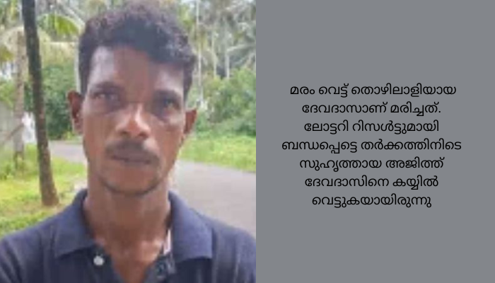 ദേവദാസ് ലോട്ടറി ടിക്കറ്റെടുത്ത് അജിത്തിന് സൂക്ഷിക്കാൻ കൊടുത്തിരുന്നു. ഇരുവരും പണം പങ്കിട്ടായിരുന്നു ലോട്ടറി ടിക്കറ്റ് വാങ്ങിയിരുന്നത്. ലോട്ടറി നറുക്കെടുപ്പിന് മുമ്പ് തന്നെ ദേവദാസ് അജിത്തിനോട് ടിക്കറ്റ് ആവശ്യപ്പെട്ടിരുന്നു. ഈ സമയത്ത് ഇരുവരുെ മദ്യലഹരിയിലായിരുന്നു. വാക്കു തർക്കത്തിനിടെ അജിത്ത് ദേവദാസിന്റെ കൈയ്ക്ക് വെട്ടുകയായിരുന്നു. രക്തം വാർന്നാണ് ദേവദാസ് മരിച്ചത്.