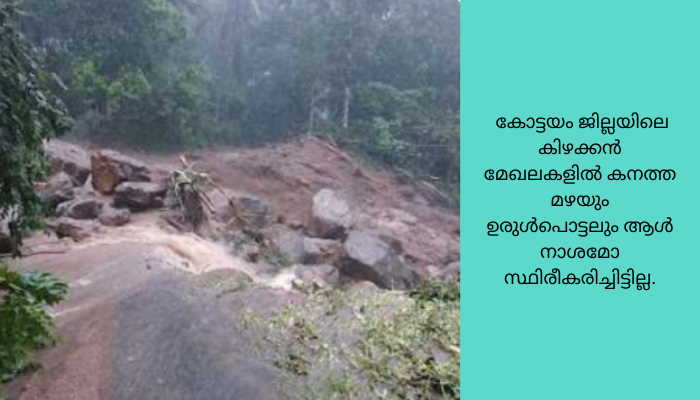 ഉരുൾ പൊട്ടലിനെ തുടന്ന് ചില ഭാഗങ്ങളിൽ റോഡ് ഒലിച്ചു പോയിട്ടുണ്ട് പലയിടങ്ങളിലും കല്ലും ചെളിയും നിറഞ്ഞ നിലയിലാണ്. പോലീസും ഫയർ ഫോഴ്സും സ്ഥലത്ത് എത്തിയിട്ടുണ്ട് സ്ഥിതിഗതികൾ വിലയിരുത്തുന്നതായും പ്രദേശ വാസികൾ അറിയിച്ചു.വാഗമൺ റൂട്ടിൽ ഇഞ്ചപ്പെട്ടി ഭാഗത്തും ഉരുൾ പൊട്ടലുണ്ടായതായി റിപ്പോർട്ടുണ്ട് നാശ നഷ്ടങ്ങളോ കോട്ടയം ജില്ലയിലെ കിഴക്കൻ മേഖലകളിൽ കനത്ത മഴയും ഉരുൾപൊട്ടലും ആൾ നാശമോ സ്ഥിരീകരിച്ചിട്ടില്ല.