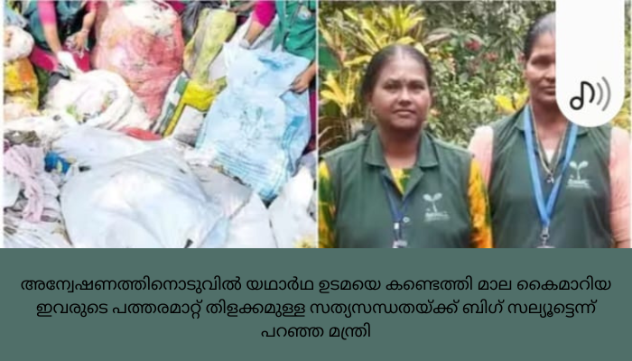 പത്ത് പവൻറെ സ്വർണമാലയാണ് മാലിന്യത്തിൽ നിന്ന് ഇവർക്ക് കിട്ടിയത്. കണ്ണൊന്ന് മഞ്ഞളിക്കാതെ ഇവർ പിന്നീട് പരിശ്രമിച്ചത് ആ സ്വർണം ഉടമസ്ഥന് തിരിച്ചുകൊടുക്കാനായാണ്. അന്വേഷണത്തിനൊടുവിൽ യഥാർഥ ഉടമയെ കണ്ടെത്തി മാല കൈമാറിയ ഇവരുടെ പത്തരമാറ്റ് തിളക്കമുള്ള സത്യസന്ധതയ്ക്ക് ബിഗ് സല്യൂട്ടെന്ന് പറഞ്ഞ മന്ത്രി, തദ്ദേശ സ്വയം ഭരണ വകുപ്പിനും സർക്കാരിനും വേണ്ടി ഹൃദയപൂർവം അഭിവാദ്യം ചെയ്യുന്നുവെന്നും ഫേസ്ബുകക്ിൽ കുറിച്ചു..