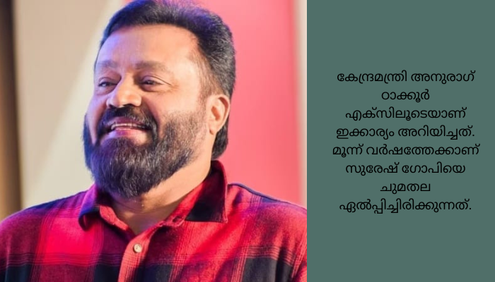 നടനും മുൻ രാജ്യസഭാംഗവുമായ സുരേഷ് ഗോപിയ്ക്ക് പുതിയ ചുമതല. താരത്തെ സത്യജിത്ത് റായ് ഫിലിം ആൻഡ് ടെലിവിഷൻ ഇൻസ്റ്റിറ്റ്യൂട്ട് അധ്യക്ഷനാക്കി കേന്ദ്രസർക്കാർ ഉത്തരവിറക്കി. കേന്ദ്രമന്ത്രി അനുരാഗ് ഠാക്കൂർ എക്‌സിലൂടെയാണ് ഇക്കാര്യം അറിയിച്ചത്. മൂന്ന് വർഷത്തേക്കാണ് സുരേഷ് ഗോപിയെ ചുമതല ഏൽപ്പിച്ചിരിക്കുന്നത്. ഇൻസ്റ്റിറ്റ്യൂട്ട് ഗവേണിംഗ് കൗൺസിൽ ചെയർമാൻ ചുമതലയും സുരേഷ ഗോപി ഇക്കാലയളവിൽ നിർവഹിക്കും.