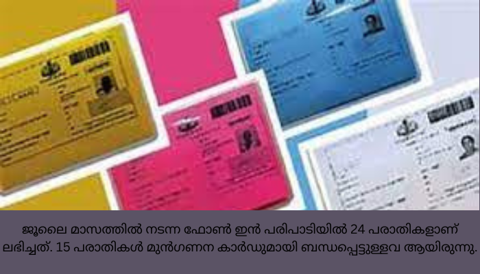 ജൂലൈ മാസത്തിൽ നടന്ന ഫോൺ ഇൻ പരിപാടിയിൽ 24 പരാതികളാണ് ലഭിച്ചത്. 15 പരാതികൾ മുൻഗണന കാർഡുമായി ബന്ധപ്പെട്ടുള്ളവ ആയിരുന്നു.