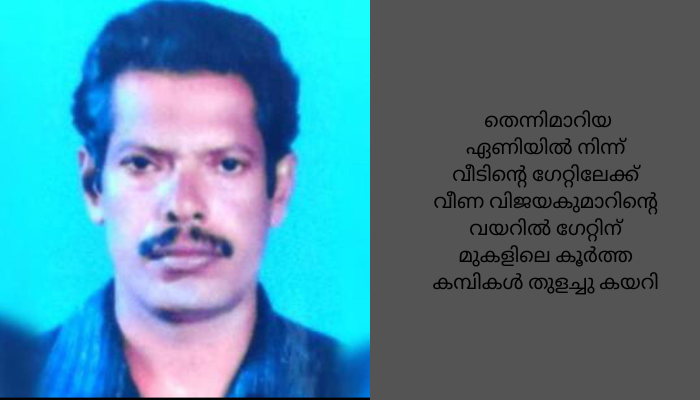 (തിങ്കൾ )ഇന്ന് പകൽ 11നാണ് സംഭവം. വിജയകുമാറിൻ്റെ അയൽപക്കത്തെ വീട്ടുകാർക്ക് തേങ്ങയിട്ടു നൽകാൻ ഏണി ചാരി തെങ്ങിൽ കയറിയതാണ്. തെന്നിമാറിയ ഏണിയിൽ നിന്ന് വീടിൻ്റെ ഗേറ്റിലേക്ക് വീണ വിജയകുമാറിൻ്റെ വയറിൽ ഗേറ്റിന് മുകളിലെ കൂർത്ത കമ്പികൾ തുളച്ചു കയറി. ഏതാനും മിനിറ്റുകൾ കമ്പിയിൽ കുരുങ്ങിക്കിടന്ന വിജയകുമാറിനെ നാട്ടുകാരെത്തി ആംബുലൻസ് വിളിച്ചു വരുത്തി മാവേലിക്കര ജില്ലാ ആശുപത്രിയിൽ എത്തിച്ചെങ്കിലും മരിച്ചു. സംസ്കാരം പിന്നീട്. ഭാര്യ: ഉഷ. മക്കൾ: വിജയലക്ഷ്മി, വിഷ്ണു (ഖത്തർ). മരുമകൻ: മഞ്ജേഷ് കുമാർ.