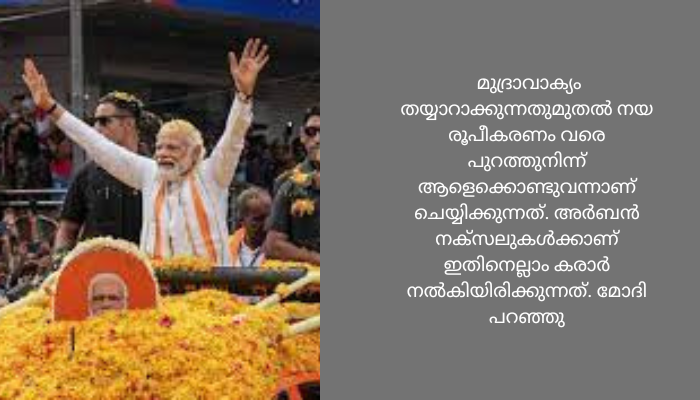 കോണ്ഗ്രസിന്റെ ഇച്ഛാശേഷി പൂര്ണമായും നഷ്ടപ്പെട്ടു. കോണ്ഗ്രസിന്റെ താഴെക്കിടയിലുള്ള നേതാക്കളെല്ലാം വാപൂട്ടി ഒരഭിപ്രായവും പറയാതെ ഇരിക്കുകയാണ്. മുദ്രാവാക്യം തയ്യാറാക്കുന്നതുമുതല് നയ രൂപീകരണം വരെ പുറത്തുനിന്ന് ആളെക്കൊണ്ടുവന്നാണ് ചെയ്യിക്കുന്നത്. അര്ബന് നക്സലുകള്ക്കാണ് ഇതിനെല്ലാം കരാര് നല്കിയിരിക്കുന്നത്. മോദി പറഞ്ഞു.