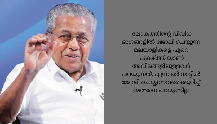 കേരളം പുതിയൊരു ഭരണ സംസ്കാരത്തിലേക്കു മെല്ലെ മാറുകയാണെന്നു മുഖ്യമന്ത്രി ചൂണ്ടിക്കാട്ടി. ലോകത്തിന്റെ വിവിധ ഭാഗങ്ങളിൽ ജോലി ചെയ്യുന്ന മലയാളികളെ ഏറെ പുകഴ്ത്തിയാണ് അവിടങ്ങളിലുള്ളവർ പറയുന്നത്. എന്നാൽ നാട്ടിൽ ജോലി ചെയ്യുന്നവരെക്കുറിച്ച് ഇങ്ങനെ പറയുന്നില്ല. പ്രത്യേകിച്ചു സർക്കാർ സർവീസിലാകുമ്പോൾ.