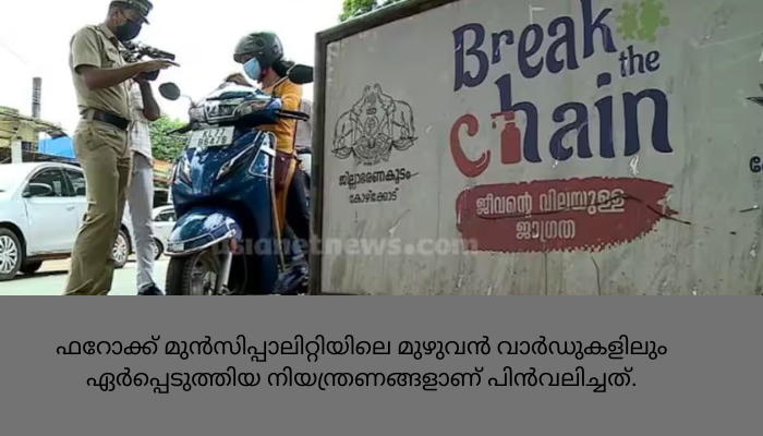 കോഴിക്കോട് കോർപ്പറേഷനിലെ ഏഴ് ഡിവിഷനുകളിലും ഫറോക്ക് മുൻസിപ്പാലിറ്റിയിലെ മുഴുവൻ വാർഡുകളിലും ഏർപ്പെടുത്തിയ നിയന്ത്രണങ്ങളാണ് പിൻവലിച്ചത്. വടകര താലൂക്കിലെ കണ്ടെയ്മെന്റ് സോണിൽ ഏർപ്പടുത്തിയിരുന്ന നിയന്ത്രണങ്ങൾ നേരത്തെ നീക്കിയിരുന്നു.