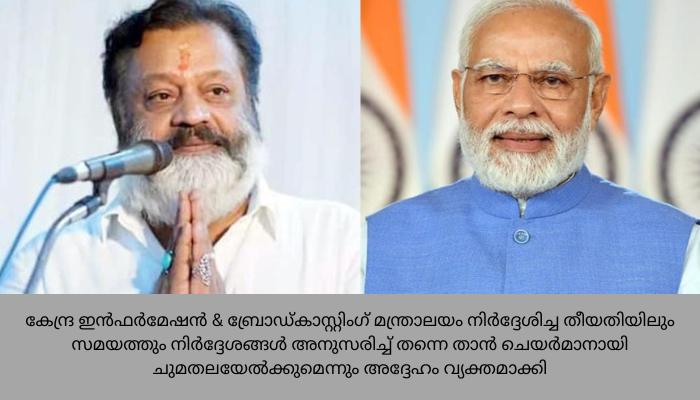 സത്യജിത്ത് റായ് ഫിലിം ആൻഡ് ടെലിവിഷൻ ഇൻസ്റ്റിറ്റ്യൂട്ട് അദ്ധ്യക്ഷനായി ഉടൻ ചുമതലയേൽക്കുമെന്ന് നടൻ സുരേഷ് ഗോപി. കേന്ദ്ര ഇൻഫർമേഷൻ & ബ്രോഡ്കാസ്റ്റിംഗ് മന്ത്രാലയം നിർദ്ദേശിച്ച തീയതിയിലും സമയത്തും നിർദ്ദേശങ്ങൾ അനുസരിച്ച് തന്നെ താൻ ചെയർമാനായി ചുമതലയേൽക്കുമെന്നും അദ്ദേഹം വ്യക്തമാക്കി. പുതിയ ഉത്തരവാദിത്വം നൽകിയതിൽ പ്രധാനമന്ത്രിയ്ക്കും ആഭ്യന്തരമന്ത്രിക്കുമടക്കം സുരേഷ് ഗോപി നന്ദിയും അറിയിച്ചു .