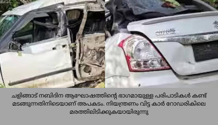 ചളിങ്ങാട് നബിദിന ആഘോഷത്തിന്റെ ഭാഗമായുള്ള പരിപാടികൾ കണ്ട് മടങ്ങുന്നതിനിടെയാണ് അപകടം. നിയന്ത്രണം വിട്ട കാർ റോഡരികിലെ മരത്തിലിടിക്കുകയായിരുന്നു. പരിക്കേറ്റവരെ കൊടുങ്ങല്ലൂരിലെ ആശുപത്രിയിൽ എത്തിച്ചെങ്കിലും രണ്ട് പേരുടെ ജീവൻ രക്ഷിക്കാൻ സാധിച്ചില്ല. വലപ്പാട് സ്വദേശികളായ അഭയ് കൃഷ്ണ, അനന്തു, അർജുൻ, കയ്പമംഗലം സ്വദേശി വിഷ്ണു എന്നിവർക്കാണ് പരിക്കറ്റത്.