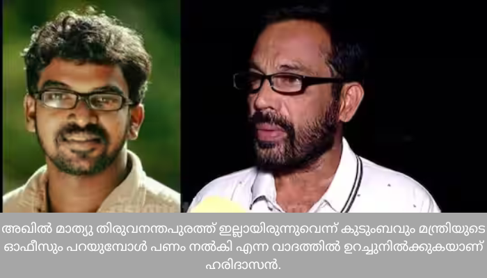 അതേസമയം പരാതിക്കാരനായ ഹരിദാസൻ കോഴ കൊടുത്തെന്ന് പറയുന്ന ഏപ്രിൽ 10 ന് വൈകീട്ട് മന്ത്രിയുടെ സ്റ്റാഫായ അഖിൽ മാത്യു പത്തനംതിട്ടയിൽ എന്ന് തെളിയിക്കുന്ന വിഡിയോ പുറത്തു വന്നിട്ടുണ്ട്. അടുത്ത ബന്ധുവിന്റെ കല്യാണ ചടങ്ങിൽ മന്ത്രിക്കൊപ്പം പങ്കെടുത്തതിന്റെ ദൃശ്യങ്ങളാണ് പുറത്ത് വന്നത്. അഖിൽ മാത്യു തിരുവനന്തപുരത്ത് ഇല്ലായിരുന്നുവെന്ന് കുടുംബവും മന്ത്രിയുടെ ഓഫീസും പറയുമ്പോൾ പണം നൽകി എന്ന വാദത്തിൽ ഉറച്ചുനിൽക്കുകയാണ് ഹരിദാസൻ.