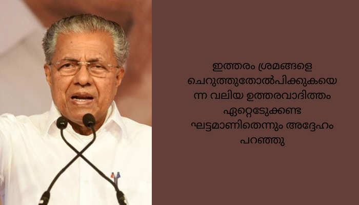കോട്ടയം: പൊതുതിന്മകൾക്കെതിരെ ഒരുമിച്ച് നിൽക്കേണ്ടവരെ തമ്മിലടിപ്പിച്ച് അവർക്കിടയിൽ ശത്രുതയും വിദ്വേഷവും വളർത്താൻ ആസൂത്രിതമായ ശ്രമം നടക്കുന്നതായി മുഖ്യമന്ത്രി പിണറായി വിജയൻ. ഇത്തരം ശ്രമങ്ങളെ ചെറുത്തുതോൽപിക്കുകയെന്ന വലിയ ഉത്തരവാദിത്തം ഏറ്റെടുേക്കണ്ട ഘട്ടമാണിതെന്നും അദ്ദേഹം പറഞ്ഞു. കോട്ടയത്ത് നടക്കുന്ന ക്രിസ്ത്യൻ കോൺഫറൻസ് ഓഫ് ഏഷ്യയുടെ (സി.സി.എ) പതിനഞ്ചാമത് ജനറൽ അസംബ്ലിയുടെ ഭാഗമായി നടന്ന ഏഷ്യൻ എക്യുമെനിക്കൽ ഫെസ്റ്റിവലിൽ മുഖ്യാതിഥിയായി പങ്കെടുത്ത് സംസാരിക്കുകയായിരുന്നു പിണറായി.