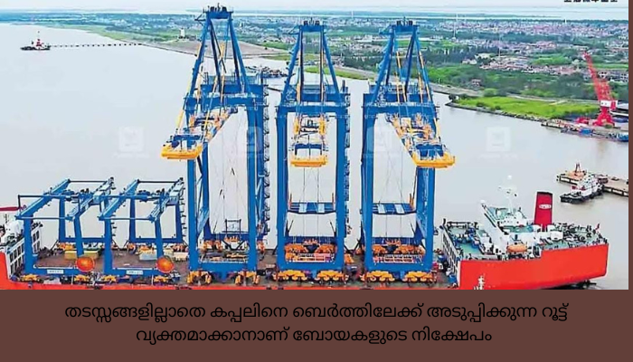 വിഴിഞ്ഞം∙രാജ്യാന്തര തുറമുഖത്ത് ഈ മാസം 15ന് അടുക്കുന്ന ആദ്യ കപ്പൽ ഷെൻഹുവ–15 യെ ബെർത്തിലേക്ക് നയിച്ചു എത്തിക്കുന്നതിനു പാത തെളിയിക്കുന്നതിനുള്ള ബോയകൾ നിക്ഷേപിച്ചു തുടങ്ങി. തടസ്സങ്ങളില്ലാതെ കപ്പലിനെ ബെർത്തിലേക്ക് അടുപ്പിക്കുന്ന റൂട്ട് വ്യക്തമാക്കാനാണ് ബോയകളുടെ നിക്ഷേപം.