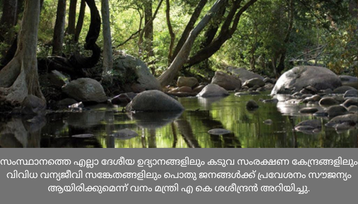 ഒക്ടോബര്‍ 2 മുതല്‍ 8 വരെ നടക്കുന്ന വന്യജീവി വാരാഘോഷത്തോട് അനുബന്ധിച്ച് സംസ്ഥാനത്തെ എല്ലാ ദേശീയ ഉദ്യാനങ്ങളിലും കടുവ സംരക്ഷണ കേന്ദ്രങ്ങളിലും വിവിധ വന്യജീവി സങ്കേതങ്ങളിലും പൊതു ജനങ്ങള്‍ക്ക് പ്രവേശനം സൗജന്യം ആയിരിക്കുമെന്ന് വനം മന്ത്രി എ കെ ശശീന്ദ്രന്‍ അറിയിച്ചു.