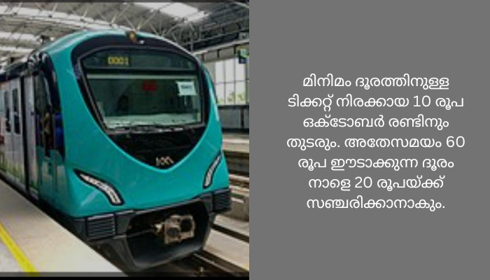 കൊച്ചി: ഗാന്ധി ജയന്തി ദിനമായ നാളെ കൊച്ചി മെട്രോയില് 20 രൂപയ്ക്ക് യാത്ര ചെയ്യാം. മിനിമം ദൂരത്തിനുള്ള ടിക്കറ്റ് നിരക്കായ 10 രൂപ ഒക്ടോബര് രണ്ടിനും തുടരും. അതേസമയം 60 രൂപ ഈടാക്കുന്ന ദൂരം നാളെ 20 രൂപയ്ക്ക് സഞ്ചരിക്കാനാകും.