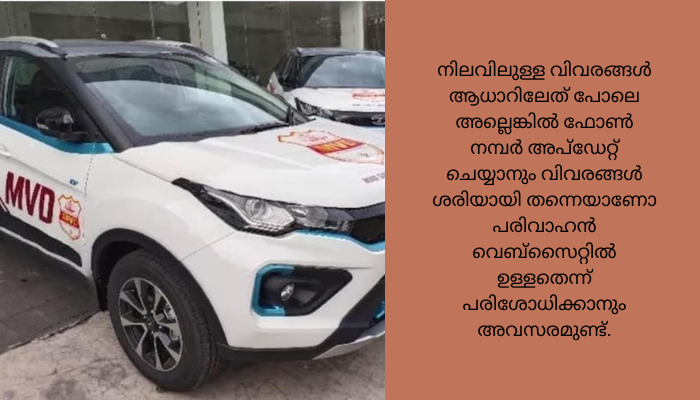 തിരുവനന്തപുരം: പരിവാഹന്‍ വെബ്‍സൈറ്റ് വഴി വാഹന സംബന്ധമായ എല്ലാ സേവനങ്ങള്‍ക്കും ഇപ്പോള്‍ വാഹന ഉടമയുടെ പേരും ഇനീഷ്യലും അവരുടെ ആധാറിലെ പേരും ഇനീഷ്യലും പോലെ തന്നെയായിരിക്കണമെന്ന് മോട്ടോര്‍ വാഹന വകുപ്പ് അറിയിച്ചിട്ടുണ്ട്. ഇതിന് പുറമെ ആധാറുമായി ലിങ്ക് ചെയ്തിട്ടുള്ള ഫോണ്‍ നമ്പര്‍ തന്നെയായിരിക്കണം വാഹന രേഖകളോടൊപ്പം പരിവാഹന്‍ സൈറ്റിലും നല്‍കിയിട്ടുള്ളത്. നിലവിലുള്ള വിവരങ്ങള്‍ ആധാറിലേത് പോലെ അല്ലെങ്കില്‍ ഫോണ്‍ നമ്പര്‍ അപ്ഡേറ്റ് ചെയ്യാനും വിവരങ്ങള്‍ ശരിയായി തന്നെയാണോ പരിവാഹന്‍ വെബ്‍സൈറ്റില്‍ ഉള്ളതെന്ന് പരിശോധിക്കാനും അവസരമുണ്ട്.