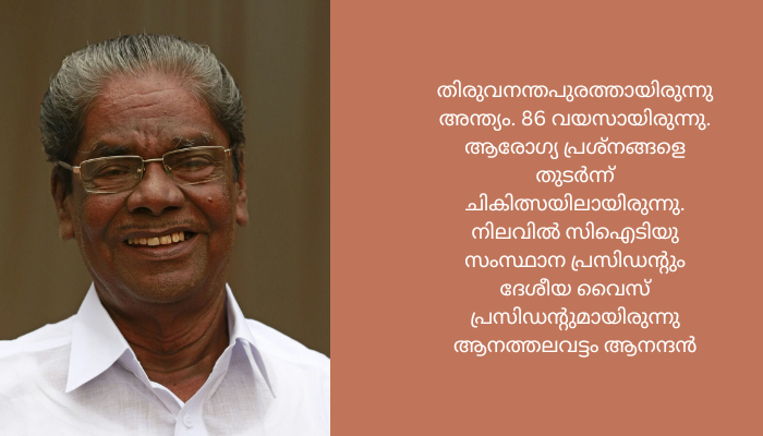 തിരുവനന്തപുരം: സിപിഎം നേതാവും മുൻ എംഎൽഎയുമായ ആനത്തലവട്ടം ആനന്ദൻ അന്തരിച്ചു. തിരുവനന്തപുരത്തായിരുന്നു അന്ത്യം. 86 വയസായിരുന്നു. ആരോഗ്യ പ്രശ്നങ്ങളെ തുടർന്ന് ചികിത്സയിലായിരുന്നു. നിലവില് സിഐടിയു സംസ്ഥാന പ്രസിഡന്റും ദേശീയ വൈസ് പ്രസിഡന്റുമായിരുന്നു ആനത്തലവട്ടം ആനന്ദൻ..