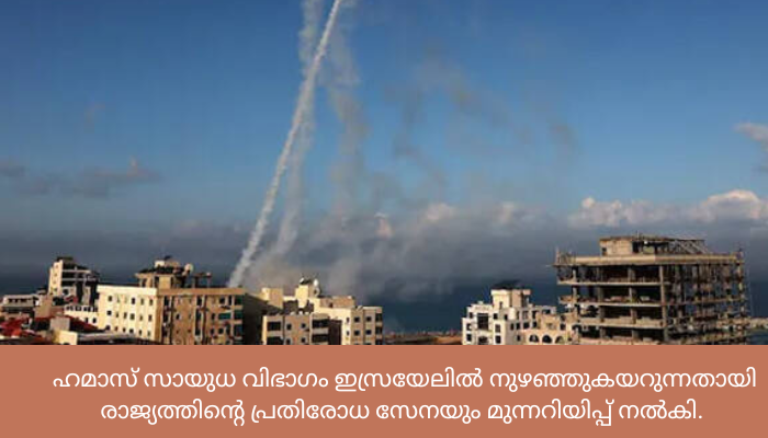 ഭീകരരായി കണക്കാക്കപ്പെടുന്ന ഹമാസ് സായുധ വിഭാഗം ഇസ്രയേലിൽ നുഴഞ്ഞുകയറുന്നതായി രാജ്യത്തിന്റെ പ്രതിരോധ സേനയും മുന്നറിയിപ്പ് നൽകി. യുദ്ധത്തിന് തയ്യാറാണെന്നും റോക്കറ്റിനെ പ്രതിരോധിക്കാനുള്ള ഉപകരണങ്ങൾ വിന്യസിച്ചിട്ടുണ്ടെന്നും ഇസ്രയേൽ സേന വ്യക്തമാക്കി.തെക്കൻ ഇസ്രയേലിൽ ഉള്ളവർ വീടിന് പുറത്തിറങ്ങരുതെന്ന് ഇസ്രയേൽ സേന നിർദേശം നൽകിയിട്ടുണ്ട്. സുരക്ഷാ സേന മേധാവികളുമായി പ്രധാനമന്ത്രി ബെഞ്ചമിൻ നെതന്യാഹു ഉടൻ യോഗം ചേരുമെന്ന് അദ്ദേഹത്തിന്റെ ഓഫീസ് അറിയിച്ചു. ഇസ്രയേലിൽ നിന്നുള്ള വീഡിയോകളും പുറത്തുവന്നിട്ടുണ്ട്