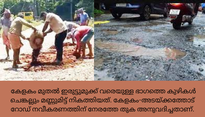 കേളകത്തെ ഐറിസ് ഓട്ടോ, ഗുഡ്സ് ഓട്ടോ ഡ്രൈവർമാരാണ് കേളകം മുതൽ ഇരുട്ടുമുക്ക് വരെയുള്ള ഭാഗത്തെ കുഴികൾ ചെങ്കല്ലും മണ്ണുമിട്ട് നികത്തിയത്. കേളകം-അടയ്ക്കത്തോട് റോഡ് നവീകരണത്തിന് നേരത്തേ തുക അനുവദിച്ചതാണ്.