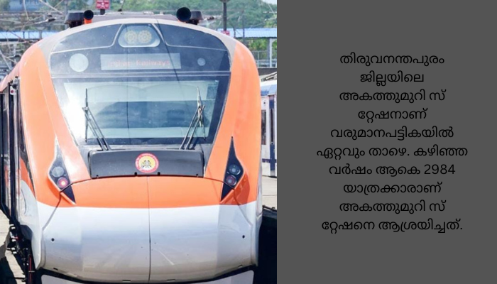 നാലാമത് തൃശൂരാണ്, വരുമാനം134 കോടി (1346198702) രൂപ. 58.58 ലക്ഷം (5871287) യാത്രക്കാർ കഴിഞ്ഞ വർഷം സ്റ്റേഷനെ ആശ്രയിച്ചു. തിരുവനന്തപുരം ജില്ലയിലെ അകത്തുമുറി സ്റ്റേഷനാണ് വരുമാനപട്ടികയിൽ ഏറ്റവും താഴെ. കഴിഞ്ഞ വർഷം ആകെ 2984 യാത്രക്കാരാണ് അകത്തുമുറി സ്റ്റേഷനെ ആശ്രയിച്ചത്. 89000 രൂപയാണ് ആകെ വരുമാനം. പ്രതിദിനം എട്ട് യാത്രക്കാരാണ് ഇവിടെയെത്തുന്നത്. പ്രതിദിന വരുമാനം 244 രൂപയും