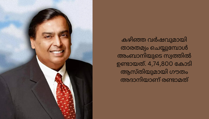 8,08,700 കോടിയാണ് അംബാനിയുടെ ആകെ ആസ്തി. രണ്ട് ശതമാനം വർധനയാണ് കഴിഞ്ഞ വർഷവുമായി താരതമ്യം ചെയ്യുമ്പോൾ അംബാനിയുടെ സ്വത്തിൽ ഉണ്ടായത്. 4,74,800 കോടി ആസ്തിയുമായി ഗൗതം അദാനിയാണ് രണ്ടാമത്. അദാനിയുടെ സ്വത്തിൽ 57 ശതമാനത്തിന്റെ ഇടിവുണ്ടായി. ഹിൻഡൻബർഗ് റിസർച്ച് റിപ്പോർട്ടിനെ തുടർന്ന് അദാനി ഓഹരികൾക്ക് വൻ ഇടിവ് രേഖപ്പെടുത്തിയതാണ് തിരിച്ചടിക്കുള്ള കാരണം.82കാരനായ സിറസ് പൂനെവാലെയാണ് മൂന്നാമത്. സിറം ഇൻസ്റ്റിറ്റ്യൂട്ടിന്റെ പ്രമോട്ടറായ പൂനെവാലയുടെ ആസ്തി 2,78,500 കോടിയാണ്. 36 ശതമാനം വർധനയാണ് രേഖപ്പെടുത്തിയത്. 2,28,900 കോടി ആസ്തിയോടെ ശിവ് നാടാറാണ് നാലാം സ്ഥാനത്ത്. ലണ്ടൻ വ്യവസായിയായ ഗോപിചന്ദ് ഹിന്ദുജ 1,76,500 കോടിയോടെ അഞ്ചാമതുണ്ട്. 1,64,300 കോടി ആസ്തിയോടെ സൺ ഫാർമസ്യൂട്ടിക്കൽ ചെയർമാൻ ദിലീപ് സാങ്വിയാണ് ആറാമത്