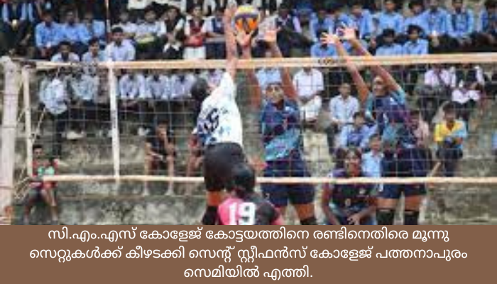 പാലാ :സെന്റ് തോമസ് കോളേജിൽ നടന്നുവരുന്ന 43 മത് ബിഷപ്പ് വയലിൽ ഇന്റർകോളേജിയേറ്റ് വോളിബോൾ ടൂർണമെന്റിൽ പത്തനാപുരം സെന്റ് സ്റ്റീഫൻസ് കോളേജ് സെമിഫൈനലിൽ പ്രവേശിച്ചു. ചൊവ്വാഴ്ച രാവിലെ നടന്ന മത്സരത്തിൽ അഞ്ചു സെറ്റ് നീണ്ടുനിന്ന വാശിയേറിയ പോരാട്ടത്തിന് ഒടുവിൽ സി.എം.എസ് കോളേജ് കോട്ടയത്തിനെ രണ്ടിനെതിരെ മൂന്നു സെറ്റുകൾക്ക് കീഴടക്കി സെന്റ് സ്റ്റീഫൻസ് കോളേജ് പത്തനാപുരം സെമിയിൽ എത്തി.