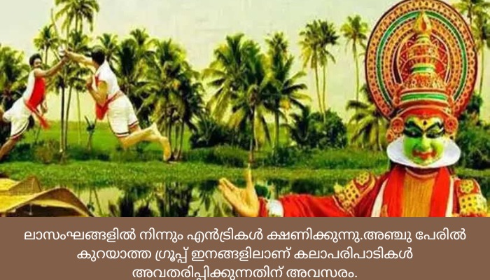 ഇൻഫര്‍മേഷൻ പബ്ലിക് റിലേഷൻസ് വകുപ്പിെൻറയും കേരള ഹൗസിെൻറയും സംയുക്താഭിമുഖ്യത്തില്‍ ഡല്‍ഹി – എൻസി ആറിലെ മലയാളി സംഘടനകളുടെ സഹകരണത്തോടെ കേരള ഹൗസില്‍ നവംബര്‍ ഒന്ന് മുതല്‍ അഞ്ച് വരെ നടത്തുന്ന കേരളപ്പിറവി- മലയാള ഭാഷാ ദിനാഘോഷത്തിലും ഔദ്യോഗിക ഭാഷാവാരാഘോഷത്തിലും കലാപരിപാടികള്‍ അവതരിപ്പിക്കുന്നതിന് മലയാളിസംഘടനകളില്‍ നിന്നും കലാസംഘങ്ങളില്‍ നിന്നും എൻട്രികള്‍ ക്ഷണിക്കുന്നു.അഞ്ചു പേരില്‍ കുറയാത്ത ഗ്രൂപ്പ് ഇനങ്ങളിലാണ് കലാപരിപാടികള്‍ അവതരിപ്പിക്കുന്നതിന് അവസരം.